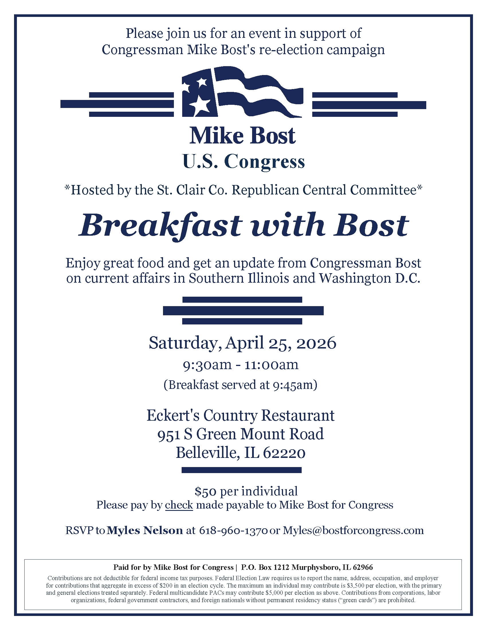 RSVP to Myles Nelson at 618.960.1370 or Myles@BostForCongress.com