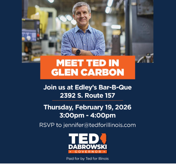 Meet Ted in Glen Carbon Thursday, February 19th 3PM - 4PM Edley's Bar-B-Que RSVP to Jennifer@TedForIllinois.com
